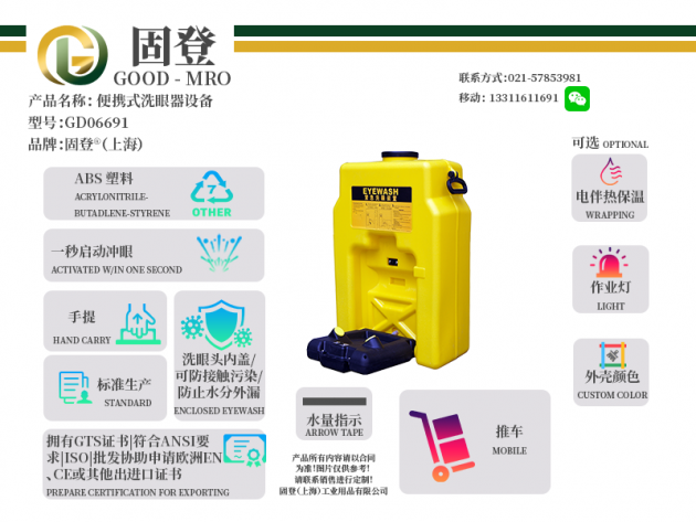 手提|便攜式|圖紙|說明書儲水桶式?jīng)_淋洗眼器、免管路安裝、適用于石油、化工、化學企業(yè)、半導體業(yè)等實驗室及戶外或移動使用,打開洗眼器1秒鐘內(nèi)噴水、耐腐的ABS塑料噴頭,水流可持續(xù)15分鐘,聚工烯桶手柄,使用方便、快速、完全可靠。另可增加移動小車及廢液收集筒,便于移動使用及環(huán)境衛(wèi)生處理。